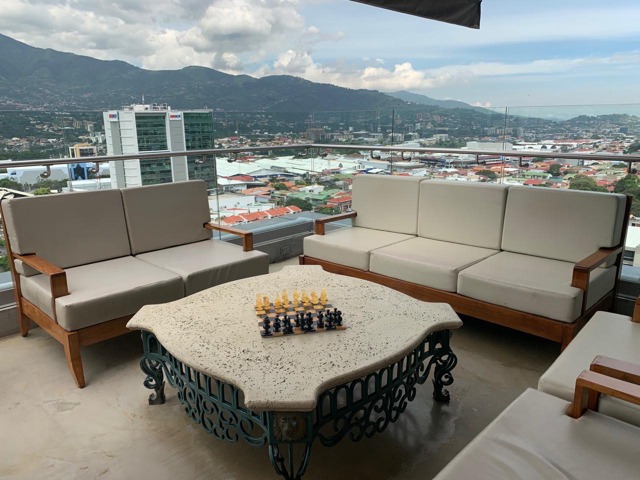 Se alquila casa amueblada tipo Penthouse ubicada en condominio en Rohrmoser, San José. El inmueble cuenta con 4 habitaciones en 4 apartamentos integrados y se pueden independizar de ser necesario, también poseen 7.5 baños, sala, comedor, cocina, 1 cuarto de servicio u oficina, elevador, bodega, balcones y parqueo para 5 automóviles. Cuenta con piscina, gym, casa club y seguridad 24/7.