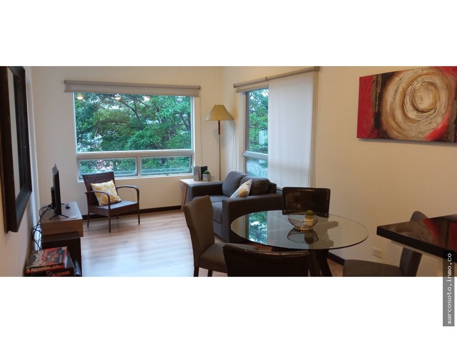 52 m2 habitables, una habitación y un baño completo con doble acceso sala, comedor, cuarto pilas, desayunador de granito, balcón, parqueo techado totalmente equipado.