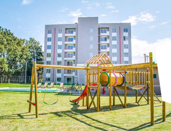 Características de los apartamentos: 2 habitaciones, estacionamiento techado para 2 vehículos, balcón, sala, comedor y cocina integrados, muebles de cocina con sobre de granito, área de pilas, piso de porcelanato y 2 baños.
