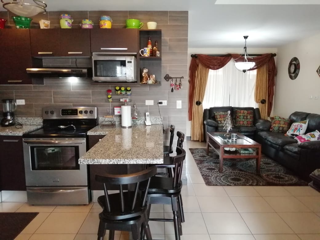 En el primer piso se encuentra una cochera techada para 2 autos, amplia sala comedor con salida a una refrescante terraza y un hermoso pequeño jardín. Cuenta con cuarto de pilas para equipo de lavado y secado separado, la cocina está integrada a las áreas sociales, tiene mueble con sobre de granito y desayunador para cuatro personas. En la segunda planta tiene una sala de televisión, 3 dormitorios siendo el principal de 4 m2 x 4 m2, baño principal, walk in closet y balcón con hermosa vista hacia las montañas. Los otros 2 dormitorios tienen un amplio closet y comparten el segundo baño completo el cual tiene puerta en ducha y lavamanos con mueble con sobre de granito. Los pisos de toda la casa son de cerámica de primera calidad.